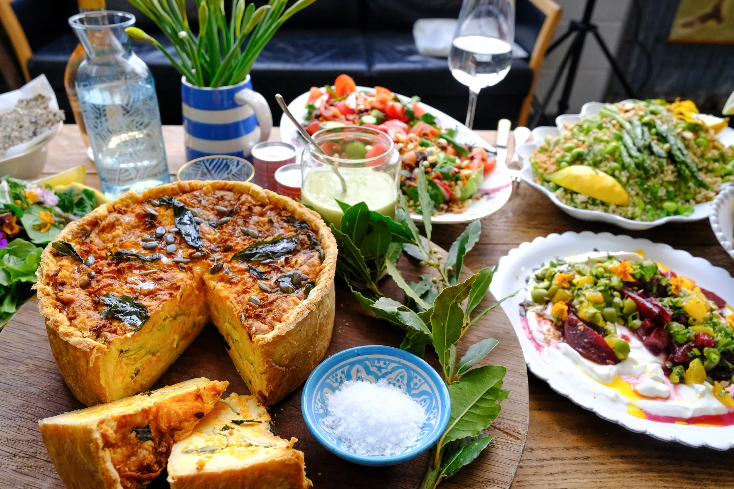 A delicious rich cheesy tart full of seasonal vegetables, herbs and cheeses