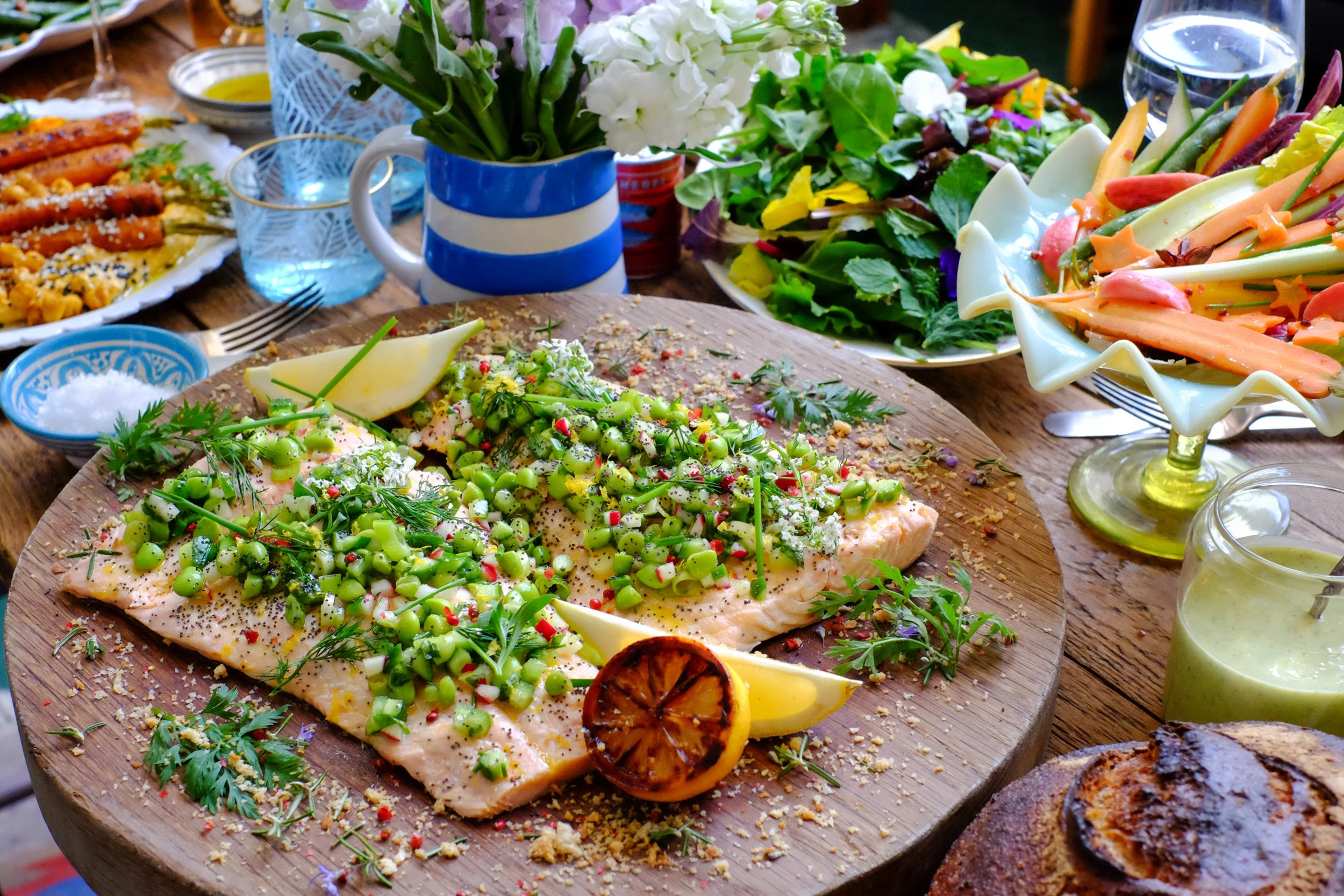 Poached and dressed sides of salmon with cucumber, baby broad bean and lemon salsa