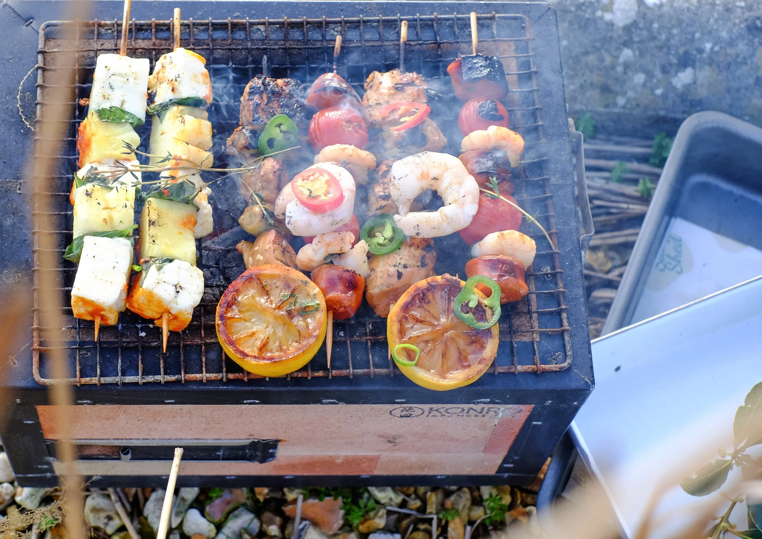 Harissa halloumi, basil and pineapple skewers